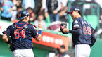 [OSEN=인천, 이대선 기자] 25일 오후 서울 인천 SK행복드림구장에서 '2018 신한은행 MY CAR KBO 리그' SK 와이번스와 롯데 자이언츠의 경기가 열렸다.1회말 만루 위기를 넘긴 롯데 포수 나원탁과 윤성빈이 하이파이브를 하고 있다./ sunday