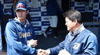 [OSEN=창원, 이동해 기자] 25일 경남 창원 마산야구장에서 열릴 예정인 '신한은행 MYCAR KBO리그' NC 다이노스와 LG 트윈스의 경기에 앞서 NC 유영준 단장이 24일(어제) 승리투수 왕웨이중에게 승리 기념공을 전달하고 있다. / eastsea@osen.