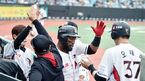 [OSEN=수원, 이동해 기자] 1일 오후 경기도 수원kt위즈파크에서 열린 '2018 신한은행 MYCAR KBO리그' kt 위즈와 두산 베어스의 경기, 7회말 1사 3루 kt 로하스가 두산 이영하 상대 투런홈런을 때린 후 더그아웃에서 팀원들과 기쁨을 함께