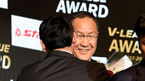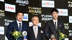 [OSEN=지형준 기자] 3일 오후 서울 홍은동 그랜드힐튼호텔에서 열린 2017-2018 도드람 V리그 시상식에서 대한항공 박기원 감독이 감독상을 수상하며 현대캐피탈 최태웅 감독의 축하를 받고 있다. /jpnews@osen.co.kr