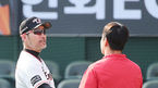 [OSEN=대전, 민경훈 기자] 3일 오후 대전 한화생명이글스파크에서 ‘2018 신한은행 MYCAR KBO리그’ 한화 이글스와 롯데 자이언츠의 경기가 열릴 예정인 가운데 양팀 훈련 시간에 한화 한용덕 감독이 롯데 민병헌과 악수를 나