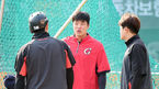 [OSEN=대전, 민경훈 기자] 3일 오후 대전 한화생명이글스파크에서 ‘2018 신한은행 MYCAR KBO리그’ 한화 이글스와 롯데 자이언츠의 경기가 열릴 예정인 가운데 양팀 훈련 시간에 롯데 민병헌이 한화 백창수, 오선진과 얘기를