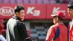 [OSEN=광주, 이대선 기자] 25일 오후 광주-KIA챔피언스필드에서 열릴 ‘2018 신한은행 MY CAR KBO리그’ KIA와 한화의 경기에 앞서 한화 양성우가 KIA 코우조 코치와 인사를 나누고 있다./sunday@osen.co.kr