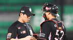 [OSEN=잠실, 박준형 기자] 3일 오후 서울 잠실구장에서 열린 2018 신한은행 MYCAR KBO리그’ 두산 베어스와 kt 위즈의 경기,연장10회말 kt 김재윤 투수와 이해창 포수가 이야기를 나누고 있다. /soul1014@osen.co.kr
