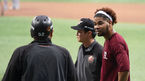 [OSEN=고척, 이대선 기자] 8일 오후 서울 고척스카이돔에서 열릴 ‘2018 신한은행 MYCAR KBO리그’ 넥센과 한화의 경기에 앞서 한화 로저스가 김태균과 장난을 치고 있다./sunday@osen.co.kr