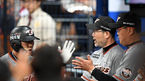 [OSEN=고척, 지형준 기자] 9일 오후 서울 고척스카이돔에서 열린 '2018 신한은행 MYCAR KBO리그' 넥센 히어로즈와 한화 이글스의 경기, 2회초 1사 1루에서 한화 하주석이 선제 투런포를 날리고 이성열, 최재훈의 축하를 받고 있다. /jpnews