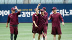[OSEN=고척, 박재만 기자] 12일 오후 고척 스카이돔에서 '2018 신한은행 MY CAR KBO리그' 넥센과 한화의 경기가 열린다.넥센 박병호, 김하성, 김민성이 몸을 풀고 있다. /pjmpp@osen.co.kr