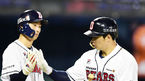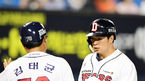 [OSEN=잠실, 민경훈 기자] 21일 오후 서울 잠실구장에서 열린 '2018 신한은행 MY CAR KBO 리그' 두산 베어스와 넥센 히어로즈의 경기, 7회말 1사 주자 1루 두산 김재환이 좌월 투런 홈런을 날린 후 덕아웃 앞에서 양의지와 하이파이브를