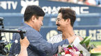 [OSEN=잠실, 박준형 기자] 23일 오후 서울 잠실야구장에서 열린 ‘2018 신한은행 MYCAR KBO리그’ LG 트윈스와 롯데 자이언츠의 경기, 4회말 이닝종료 후 박용택의 최다안타 달성 기념식에서 양준혁이 박용택에게 꽃다발을 전달