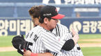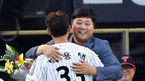[OSEN=잠실, 박준형 기자] 23일 오후 서울 잠실야구장에서 열린 ‘2018 신한은행 MYCAR KBO리그’ LG 트윈스와 롯데 자이언츠의 경기, 4회말 이닝종료 후 박용택의 최다안타 달성 기념식에서 LG 류중일 감독이 박용택에게 꽃다발