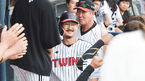 [OSEN=잠실, 박준형 기자] 23일 오후 서울 잠실야구장에서 열린 ‘2018 신한은행 MYCAR KBO리그’ LG 트윈스와 롯데 자이언츠의 경기. 4회말 1사 2루 김현수의 2루타때 홈을 밟은뒤 동료들의 축하를 받고 있다. 박용택은 전타석에
