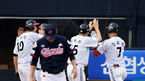 [OSEN=잠실, 이동해 기자] 23일 오후 서울 잠실야구장에서 열린 '2018 신한은행 MYCAR KBO리그' LG 트윈스와 롯데 자이언츠의 경기, ,4회말 1사 1,2루 LG 정주현이 스리런 홈런을 때린 후 팀원들과 하이파이브 하고 있다. 노경은 강판. / eas