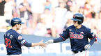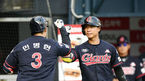 [OSEN=잠실, 박재만 기자] 24일 오후 서울 잠실야구장에서 ‘2018 신한은행 MY CAR KBO리그’ LG와 롯데의 경기가 열렸다.6회초 2사 롯데 민병헌이 동점 솔로포를 날린 뒤 나경민과 하이파이브를 하고 있다. /pjmpp@osen.co.kr