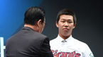 [OSEN=최규한 기자] 25일 오후 서울 소공동 웨스틴조선호텔에서 '2019 KBO 신인 1차 지명' 행사가 열렸다.롯데 1차지명 경남고 투수 서준원이 이윤원 단장에게 유니폼을 전달받고 있다. /dreamer@osen.co.kr