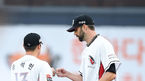 [OSEN=수원, 곽영래 기자] 29일 오후 경기도 수원 kt위즈파크에서 '2018 신한은행 MYCAR KBO리그' kt 위즈와 NC 다이노스의 경기가 열렸다.1회초 kt 니퍼트가 NC 박민우의 타구를 잡아낸 윤석민과 주먹을 맞대고 있다. / youngrae@osen.co.kr