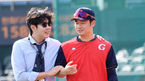 [OSEN=대전, 이동해 기자] 29일 오후 대전 한화생명이글스파크에서 열릴 예정인 '2018 신한은행 MY CAR KBO리그' 한화 이글스와 롯데 자이언츠의 경기에 앞서 롯데 손승락이 정민철 해설위원과 이야기 나누며 미소 짓고 있다. / eastsea@os