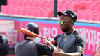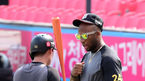 [OSEN=수원, 곽영래 기자] 29일 오후 경기도 수원 kt위즈파크에서 열리는 '2018 신한은행 MYCAR KBO리그' kt 위즈와 NC 다이노스의 경기에 앞서 kt 로하스가 송민섭의 타격폼을 잡아주고 있다. / youngrae@osen.co.kr