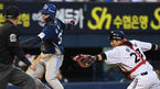 [OSEN=잠실, 최규한 기자] 4일 오후 서울 잠실야구장에서 '2018 신한은행 MY CAR KBO리그' LG 트윈스와 NC 다이노스의 경기가 열렸다.4회초 2사 2루 상황 NC 권희동의 추격의 좌전 적시타 때 홈으로 쇄도한 2루주자 김성욱이 홈에서 LG 포