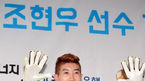 [OSEN=민경훈 기자] 4일 오후 서울 마포구 상암동 중소기업DMC타워에서 국제축구연맹(FIFA) 러시아 월드컵에서 활약하고 돌아 온 대구FC 조현우가 KEB하나은행 K리그 2018 재개 기자 간담회를 갖고 있다. 포토타임 중 아내 문신을 보여