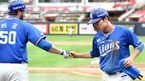 [OSEN=수원, 이대선 기자] 5일 오후 수원kt위즈파크에서 ‘2018 신한은행 MYCAR KBO리그’ kt와 삼성의 경기가 열렸다.1회초 1사 3루에서 삼성 이원석의 내야땅볼때 홈을 밟은 3루주자 박해민이 러프의 축하를 받고 있다./sunday@osen.
