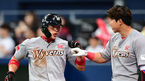 [OSEN=고척, 민경훈 기자] 5일 오후 서울 고척스카이돔서 열린 '2018 신한은행 MY CAR KBO 리그' 넥센 히어로즈와 SK 와이번스의 경기, 8회초 1사 주자 1,2루 SK 로맥의 중견수 뒤 1타점 적시타때 홈을 밟은 노수광이 덕아웃 앞에서 김동엽