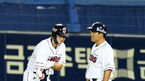 [OSEN=잠실, 이대선 기자] 6일 오후 서울 잠실야구장에서 ‘2018 신한은행 MYCAR KBO리그’ 두산과 삼성의 경기가 열렸다.4회초 1사 만루에서 두산 김재환의 역전 적시타때 홈을 밟은 허경민과 류지혁이 더그아웃에서 축하를 받
