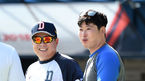 [OSEN=잠실, 이대선 기자] 6일 오후 서울 잠실야구장에서 열릴 ‘2018 신한은행 MYCAR KBO리그’ 두산과 삼성의 경기에 앞서 두산 김태형 감독과 삼성 이원석이 인사를 나누고 있다./sunday@osen.co.kr