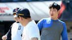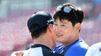 [OSEN=잠실, 이대선 기자] 6일 오후 서울 잠실야구장에서 열릴 ‘2018 신한은행 MYCAR KBO리그’ 두산과 삼성의 경기에 앞서 삼성 이원석이 두산 양의지와 장난을 치고 있다./sunday@osen.co.kr