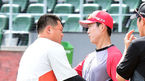 [OSEN=인천, 곽영래 기자] 8일 오후 인천 SK행복드림구장에서 열리는 '2018 신한은행 MYCAR KBO리그' SK 와이번스와 한화 이글스의 경기에 앞서 한화 양성우가 SK 정수성 코치와 이야기를 나누고 있다. / youngrae@osen.co.kr