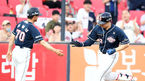 [OSEN=수원, 이동해 기자] 12일 오후 경기도 수원kt위즈파크에서 열린 '2018 신한은행 MYCAR KBO리그' kt 위즈와 두산 베어스의 경기, 4회초 두산 선두타자 김재환이 솔로홈런을 뽑아낸 김재환이 공필성 코치와 하이파이브를 하고 있다.