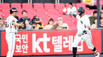 [OSEN=수원, 이동해 기자] 12일 오후 경기도 수원kt위즈파크에서 열린 '2018 신한은행 MYCAR KBO리그' kt 위즈와 두산 베어스의 경기, 3회말 kt 선두타자 황재균이 솔로홈런을 때린 후 최태원 코치와 하이파이브를 하고 있다. / eastsea@osen.c