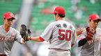 [OSEN=잠실, 지형준 기자] 12일 오후 서울 잠실야구장에서 열린 '2018 신한은행 MYCAR KBO리그' LG 트윈스와 SK 와이번스의 경기, 2회말 1사 1루에서 SK 박종훈이 LG 이천웅을 2루 땅볼 병살로 처리하며 김성현, 나주환과 기뻐하고 있다. /jp