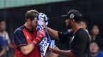 [OSEN=울산, 최규한 기자] 14일 오후 울산 문수야구장에서 '2018 신한은행 MYCAR KBO 올스타전'이 열렸다.5회말 종료 후 진행된 홈런레이스 결승전, 나눔올스타 한화 호잉이 홈런레이스를 펼치는 가운데 팀 동료 샘슨이 땀을 닦아주고