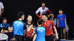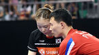 [OSEN=대전, 이동해 기자] 19일 오전 대전 충무체육관에서 '2018 국제탁구연맹 월드투어 코리아오픈' 최일-유은총 조(남북 단일팀)와 이상수-전지희 조(한국)의 혼합복식 16강전이 진행됐다.남북 단일팀이 서브 작전을 짜고 있다. / ea