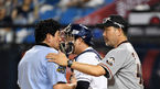 [OSEN=문학, 이동해 기자] 7일 오후 인천 SK행복드림구장 열린 '2018 신한은행 MYCAR KBO리그' SK 와이번스와 삼성 라이온즈의 경기, 9회말 SK 이성우의 파울 타구를 잡기 위해 몸 날린 삼성 포수 강민호를 힐만 감독이 일으켜 세워준 후
