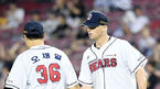 [OSEN=잠실, 이동해 기자] 8일 오후 서울 잠실야구장에서 열린 '2018 신한은행 MYCAR KBO리그' 두산 베어스와 한화 이글스의 경기, 6회초 두산 후랭코프가 한화 이용규의 내야땅볼 타구를 호수비로 처리한 오재일에게 고마움을 표하고