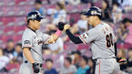 [OSEN=잠실, 이동해 기자] 8일 오후 서울 잠실야구장에서 열린 '2018 신한은행 MYCAR KBO리그' 두산 베어스와 한화 이글스의 경기, 4회초 1사 만루 한화 정근우가 2타점 적시타를 뽑아낸 후 고동진 코치와 하이파이브를 하고 있다. / easts