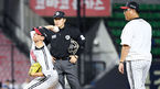 [OSEN=잠실, 이동해 기자] 10일 오후 서울 잠실야구장에서 열린 '2018 신한은행 MYCAR KBO리그' LG 트윈스와 삼성 라이온즈의 경기, 7회초 박근영 주심이 LG 최동환과 마운드에서 이야기 나누고 있다. / eastsea@osen.co.kr