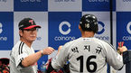 [OSEN=고척, 최규한 기자] 11일 오후 고척 스카이돔에서 '2018 신한은행 MY CAR KBO리그' 넥센 히어로즈와 LG 트윈스의 경기가 열렸다.5회초 무사 2루 상황 LG 박용택의 1타점 동점 적시타 때 홈을 밟은 박지규가 류중일 감독과 인사를 나
