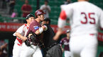 [OSEN=인천, 곽영래 기자] 5일 오후 인천 SK행복드림구장에서 '2018 신한은행 MYCAR KBO리그' SK 와이번스와 넥센 히어로즈의 경기가 열렸다.9회초 1사 넥센 박병호가 SK 정영일에게 사구를 맞은 뒤 신경전을 벌이고 있다. / youngrae@osen.co.
