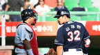 [OSEN=인천, 최규한 기자] 9일 오후 인천 SK행복드림구장에서 '2018 신한은행 MY CAR KBO리그' SK 와이번스와 두산 베어스의 경기가 열렸다.6회초 1사 주자없는 상황 두산 김재환이 삼진으로 물러나며 SK 포수 이재원과 대화를 나누고 있