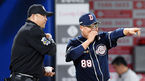 [OSEN=부산, 이동해 기자] 11일 오후 부산 사직야구장에서에서 '신한은행 MYCAR KBO리그' 롯데 자이언츠와 두산 베어스의 경기가 열렸다.7회말 양팀 수비 교체 때 두산 김태형 감독이 장준영 주심에게 웃으며 어필하고 있다. / eastsea@o