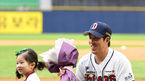 [OSEN=잠실, 지형준 기자] 15일 오후 서울 잠실야구장에서 열린 '2018 신한은행 MYCAR KBO리그' 두산 베어스와 NC 다이노스의 경기, 경기에 앞서 두산 김승회가 500경기 출장 KBO 시상식을 하며 딸의 축하를 받고 있다. /jpnews@osen.co.kr