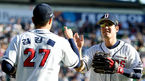 [OSEN=잠실, 박재만 기자] 25일 오후 서울 잠실야구장에서 ‘2018 신한은행 MY CAR KBO리그’ 두산 베어스와 넥센 히어로즈의 경기가 열렸다.6회초 무사 1,3루 위기를 무실점으로 막은 두산 김강률과 김재호가 하이파이브를 하고