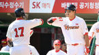 [OSEN=인천, 곽영래 기자] 25일 오후 인천 SK행복드림구장에서 '2018 신한은행 MYCAR KBO리그' SK 와이번스와 LG 트윈스의 경기가 열렸다.1회말 무사 SK 힐만 감독이 선두타자 솔로 홈런을 때려낸 노수광가 주먹을 맞대고 있다. / youngrae@ose