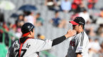 [OSEN=인천, 지형준 기자] 26일 오후 인천SK행복드림구장에서 열린 '2018 신한은행 MYCAR KBO리그' SK 와이번스와 LG 트윈스의 경기, 7회말 2사에서 LG 배재준이 SK 노수광에 내야 안타를 허용하며 마운드를 내려가고 있다. 격려하는 유강