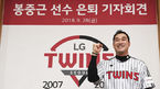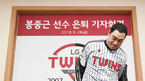 [OSEN=잠실, 한용섭 기자]LG 투수 봉중근(38)이 은퇴 기자회견을 갖고 팬들에게 감사 인사를 전했다.봉중근은 28일 잠실구장에서 기자회견을 갖고 12시즌 LG 선수 생활을 마쳤다. LG 홈 유니폼 위에 유광 점퍼까지 입고 기자회견장에