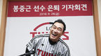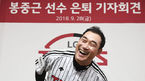 [OSEN=잠실,박준형 기자] 28일 오후 서울 잠실구장에서LG 트윈스 투수 봉중근(38)이 은퇴 기자회견을 가졌다.봉중근은 이날 열리는 KIA전에 앞서 마지막 투구를 하며 은퇴식을 갖는다.봉중근이 기자회견을 미소 짓고 있다/ soul1014@osen