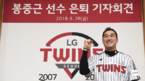 [OSEN=잠실,박준형 기자] 28일 오후 서울 잠실구장에서LG 트윈스 투수 봉중근(38)이 은퇴 기자회견을 가졌다.봉중근은 이날 열리는 KIA전에 앞서 마지막 투구를 하며 은퇴식을 갖는다,봉중근이 기자회견을 마치고 포즈를 취하고 있