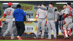 [OSEN=대구, 이동해 기자] 29일 오후 대구 삼성라이온즈파크에서 열린 '2018 신한은행 MY CAR KBO리그' 삼성 라이온즈와 SK 와이번스의 경기, 6회말 SK 서진용이 만루위기를 벗어난 후 팀원들에게 축하를 받고 있다. / eastsea@osen.co.kr